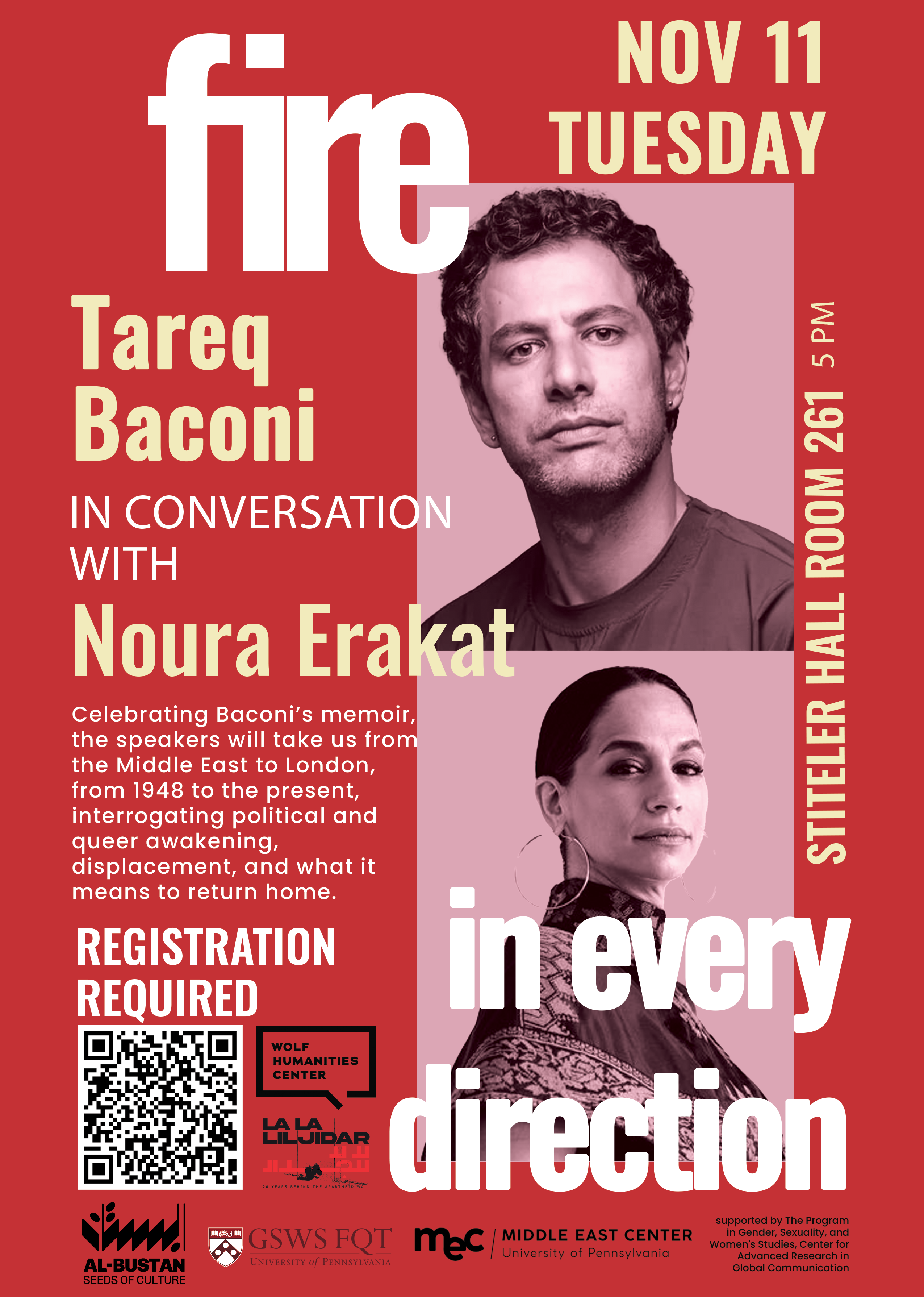 Noura Erakat and Tareq Baconi will be celebrating Baconi's new book, "Fire in Every Direction", a memoir of political and queer awakening, of impossible love amidst generations of displacement, and what it means to return home.